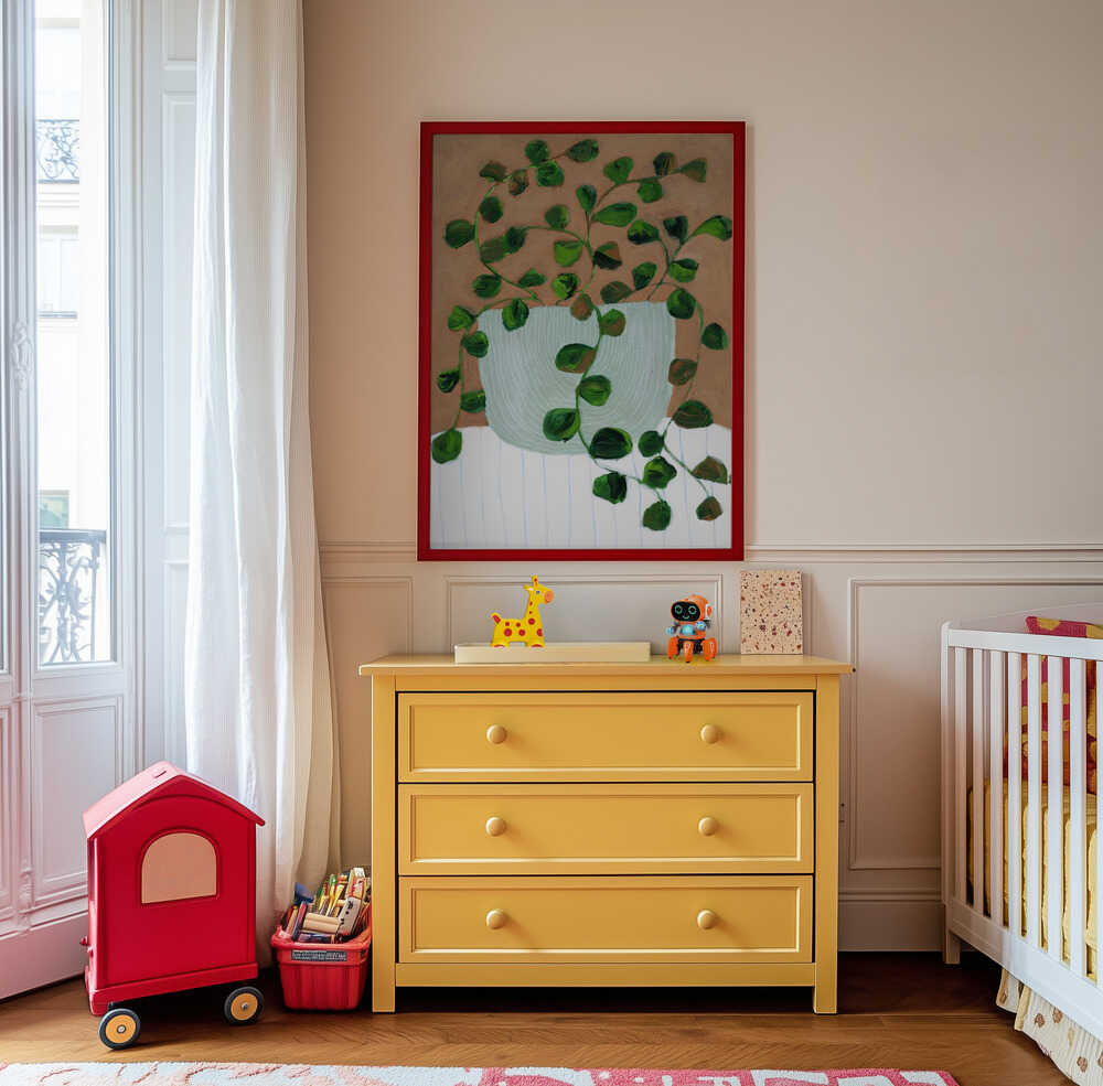 Tuo kotiisi luonnonrauhaa tällä seesteisellä taidejulisteella, jossa vihreät köynnökset laskeutuvat pehmeästä, teksturoidusta ruukusta lämpimän maanläheisiä sävyjä vasten. Minimalistinen sommittelu ja tasapainoinen väripaletti luovat harmonisen ja rauhoittavan tunnelman ilman, että tila tuntuu raskaalta. Ajaton mutta leikkisä tyyli tekee siitä täydellisen valinnan pinnasängyn yläpuolelle, lukusoppeen tai työpöydän ääreen. Kaunis ja moderni valinta lastenhuoneeseen, vauvanhuoneeseen tai perhetilaan – ja sopii erinomaisesti skandinaaviseen sisustukseen ja taideseiniin. Painettu museolaatuiselle mattapaperille, joka säilyttää värit ja yksityiskohdat vuodesta toiseen.